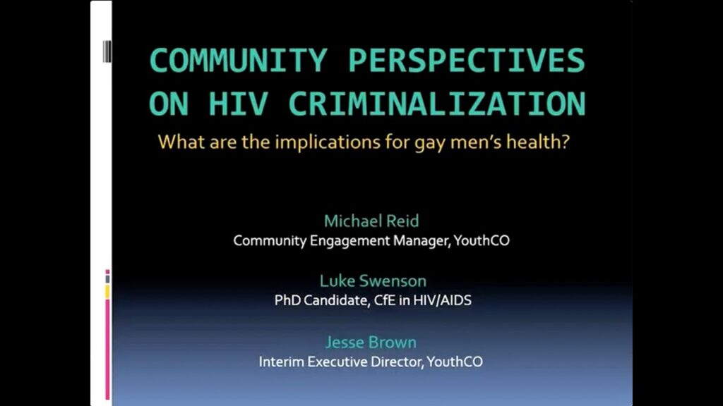 Reid, Michael; Swenson, Luke; and Brown, Jesse. (2011). Community Perspectives on Criminalization: What Are the Implications for Gay Men’s Health? Presented at the Gay Men’s Health Summit, Vancouver, Canada.