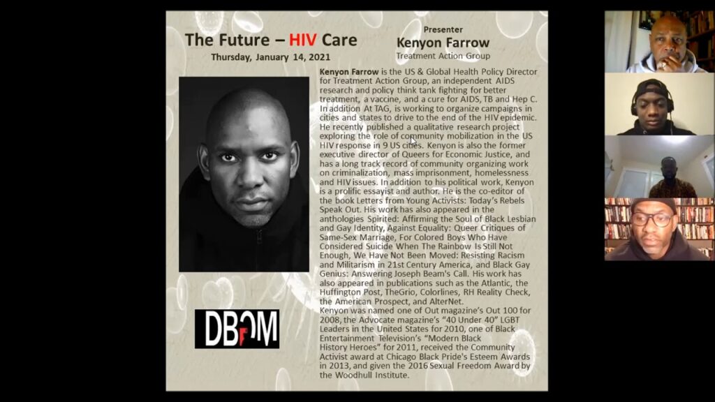 DBGM hosts, “The Future – HIV Care”, with panelists, Kenyon Farrow, Jahlove Serrano (CEP), Onyedikachi Precious Nwogu, Ty Martin (SAGE UDA), and Tim’m West (Teach for America) discussing HIV care for Black gay men, and looking at shame and stigma as factors.