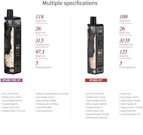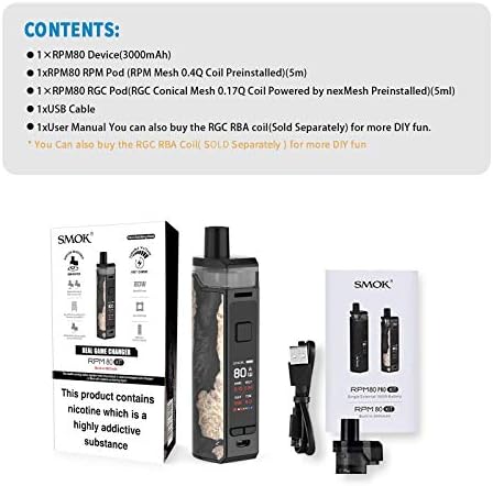 Includes: 1 x RPM80 Pro Device 1 x RPM80 RPM Pod (RPM Mesh 0.4Ω Coil Preinstalled) (2ml) 1 x RPM80 RGC Pod (RGC Conical Mesh 0.17Ω Coil Powered by nexMesh Preinstalled) (2ml) 1 x USB Cable 1 x User Manual