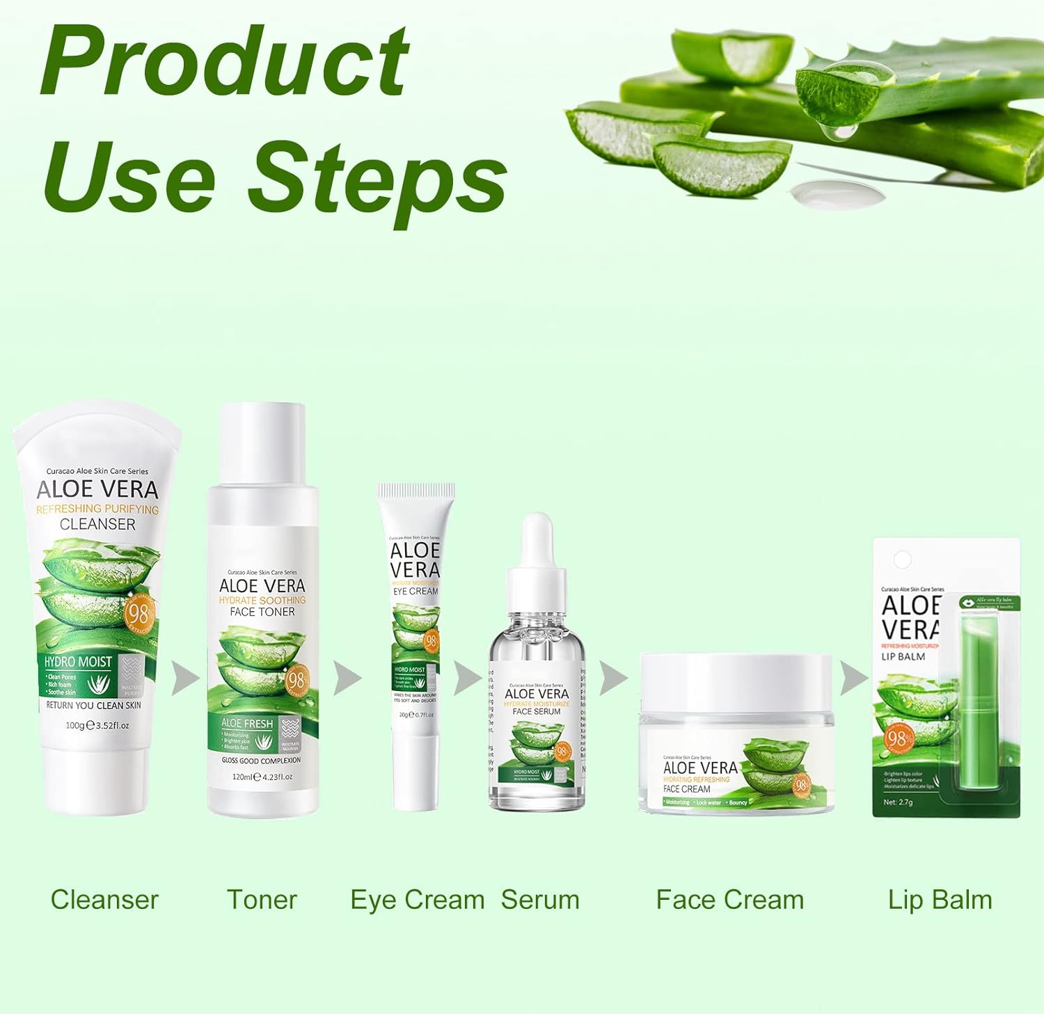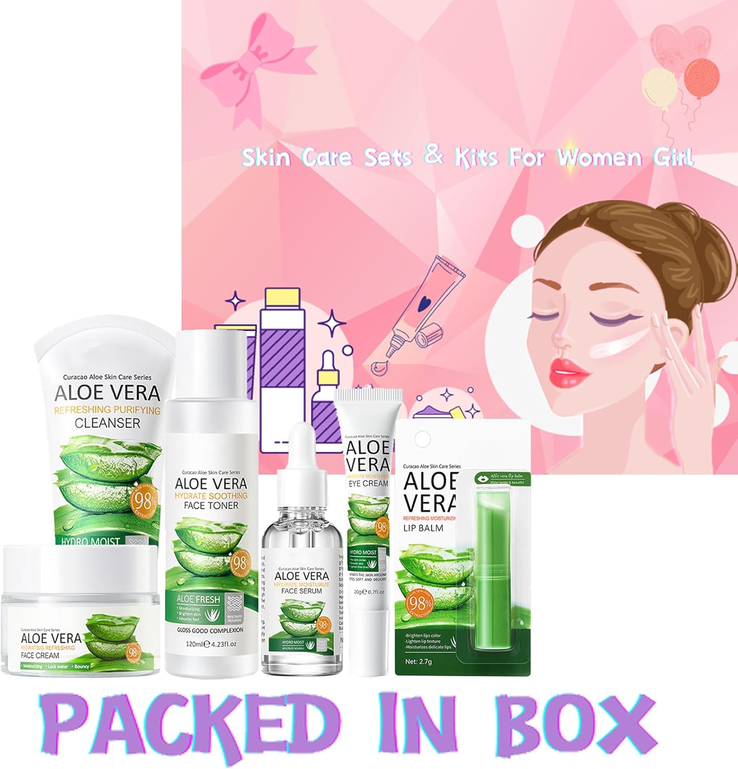 【Skincare Gift Set】 The 6-piece beauty gifts sets for women contain our facial cleanser, toner, lip balm, face serum, eye cream, face cream. With the gentle effect of aloe vera, the beauty products can hydrate your face, sooth and moisturize your skin, helping to tackle the 5 early signs of dehydrated skin: dryness, dullness, dry dehydration lines, tightness, and roughness.