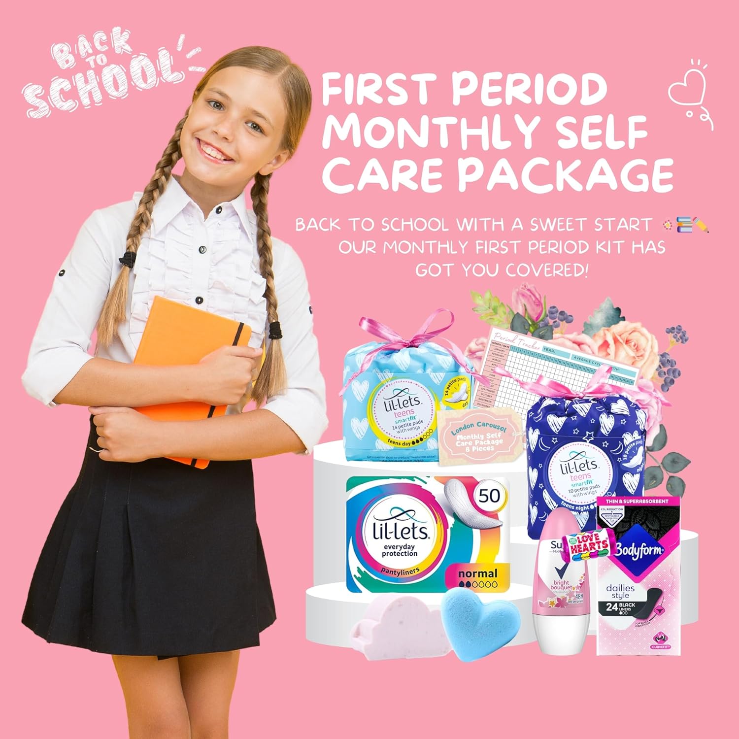 Monthly Period Self Care Package – Designed with pre-teens and teen girls in mind, this care package includes everything she needs to navigate the changes and growth of her body with confidence. Our period pack is an ideal gift for teens for a daughter, granddaughter or niece – Check out our other girls period starter kit and starting school gifts for girls with a variety of products inside