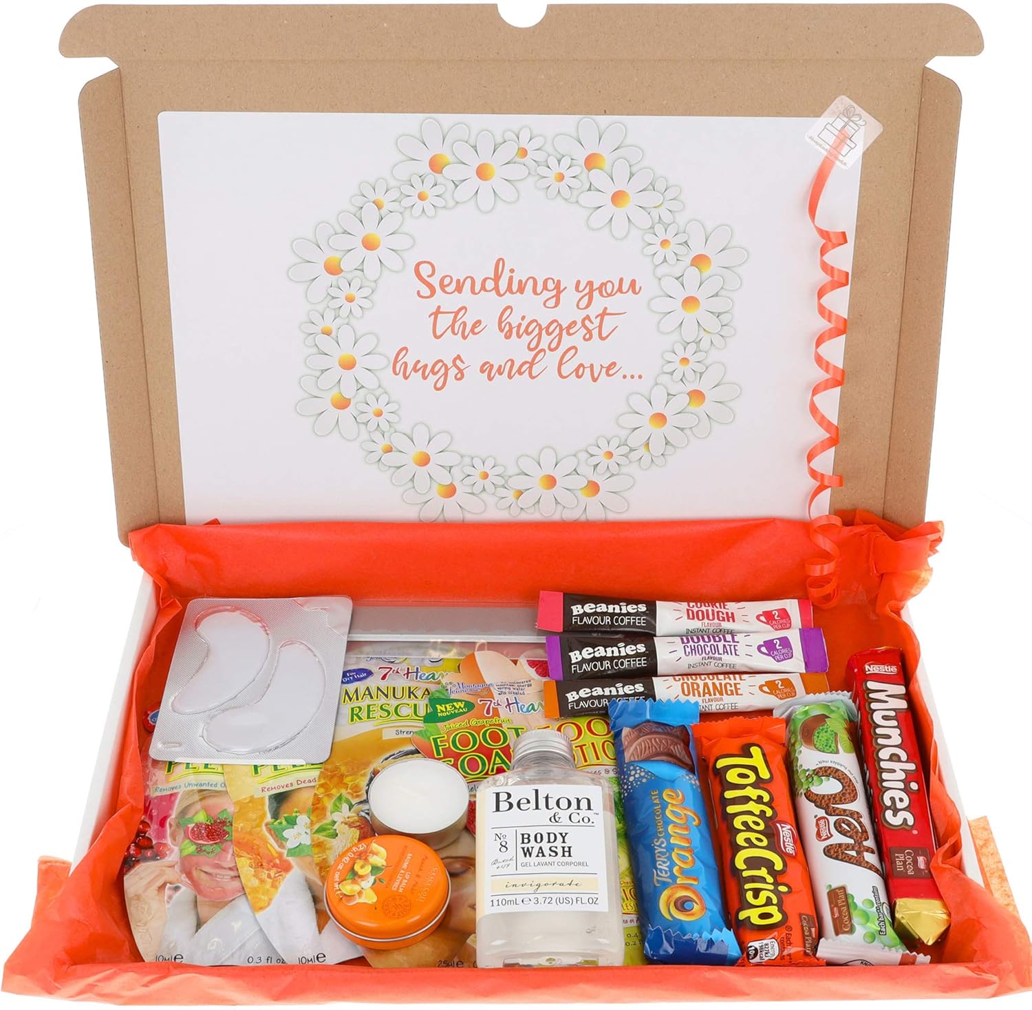 Sending a hug in a box brighten someone’s day with this larger pamper gift box delivered straight to their door! Who doesn’t love a little pamper and a treat? Self care is so so important, especially when you need a pick me up! Pamper Gift Box Contains – 3 x Coffee Sachets, 2 x Face Mask, 1 x Foot Mask, 1 x Hair Mask, 1 x Tealight Candle, 1 x Pack of Under Eye Patches , 1 X Nail File, 1 x Lip Balm, 1 x Shampoo Bar & 4 x Chocolate Bars. Sending You The Biggest Hugs and Love Backing Sticker and the Gift Card saying Take Some Time To Treat Yourself You Deserve It! The gift box can be sent directly to the recipient.