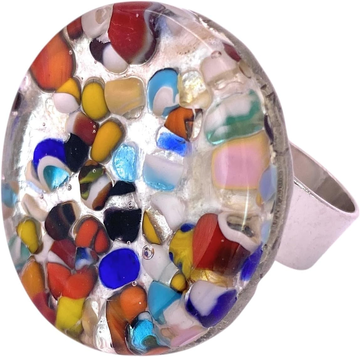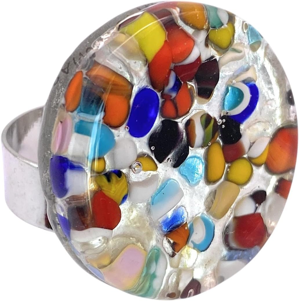 A genuine Murano Glass Ring from Venice, Italy. A lovely large chunky statement ring made using millefiori pieces, approx. 3cm in diameter. The glass is mounted on an adjustable silver plated ring shank – one size fits all. Includes a Certificate of Authenticity and packed in an attractive gift box. This unique, genuine Murano Glass Ring is handmade on the Island of Murano in Venice, Italy, using techniques built upon by hundreds of years of Venetian artistic heritage. Our Murano Glass products have been crafted by hand in small individual workshops on Murano since the year 1291. Since 2006 we have forged relationships with these talented Murano Glassmasters and we strive to import and distribute the very best 100% authentic Murano Glass pieces we can find for our valued customers.