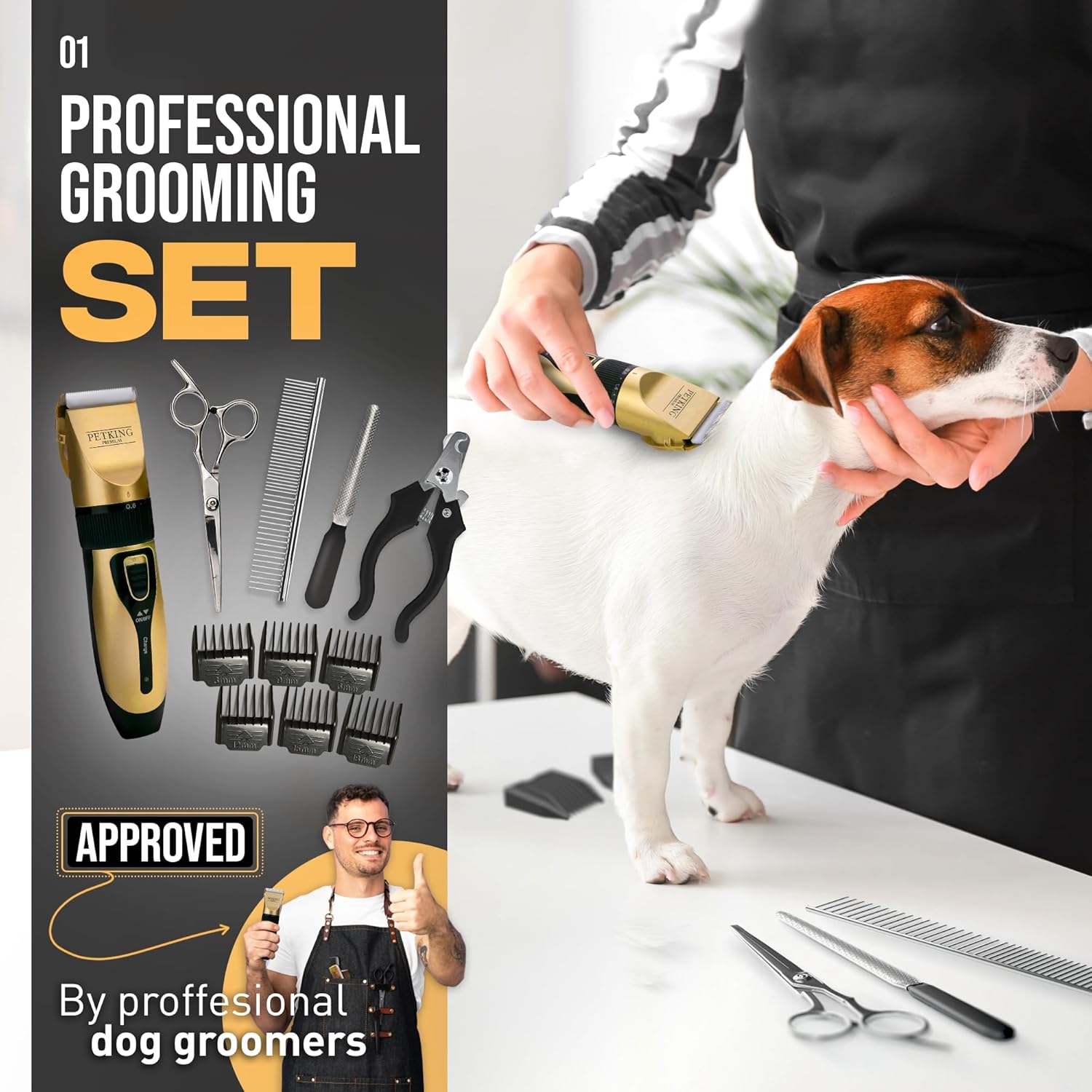 COMPLETE PROFESSIONAL DOG GROOMING KIT. This complete grooming package includes 1 professional dog clipper with blade, 1 rechargeable battery, 6 detachable guide combs, 1 cleaning brush, 1 stainless steel scissor, 1 stainless steel comb, 1 nail clipper, 1 nail file, and 1 user manual. Designed for even the thickest coats, this dog grooming kit ensures precision and convenience for professional and home use.