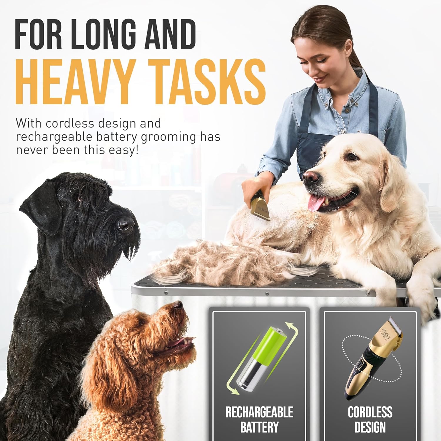 PREMIUM QUALITY ASSURANCE. Crafted from high-quality materials, these electric dog grooming clippers guarantee top-tier performance. No unexpected power loss, clogging from pet hair, or interruptions—just a smooth grooming experience. The dog grooming kit is built for durability, making it a trusted choice for professional groomers and pet owners who demand reliability and efficiency.