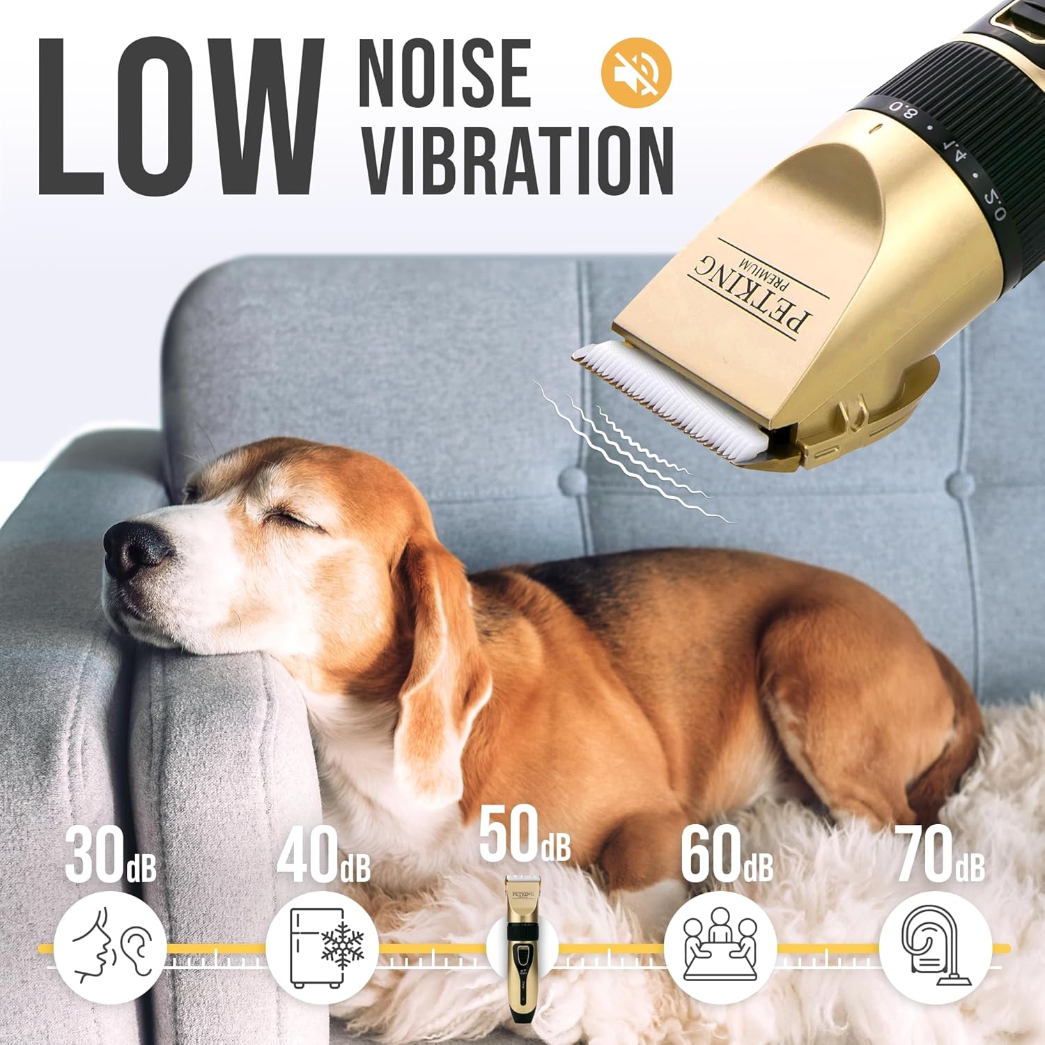ULTRA-QUIET OPERATION. Does your pet get nervous during grooming? Our low-noise dog grooming clippers operate at less than 58 dB, significantly reducing anxiety and stress. The advanced noise reduction technology and low-vibration motor create a calm and soothing experience, making it ideal for nervous pets, puppies, and senior dogs. Keep your pet relaxed while achieving a professional-grade grooming result at home!