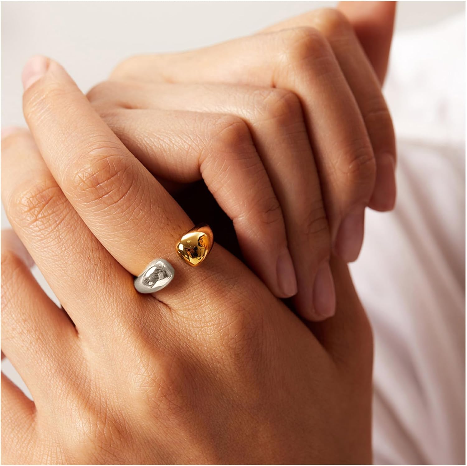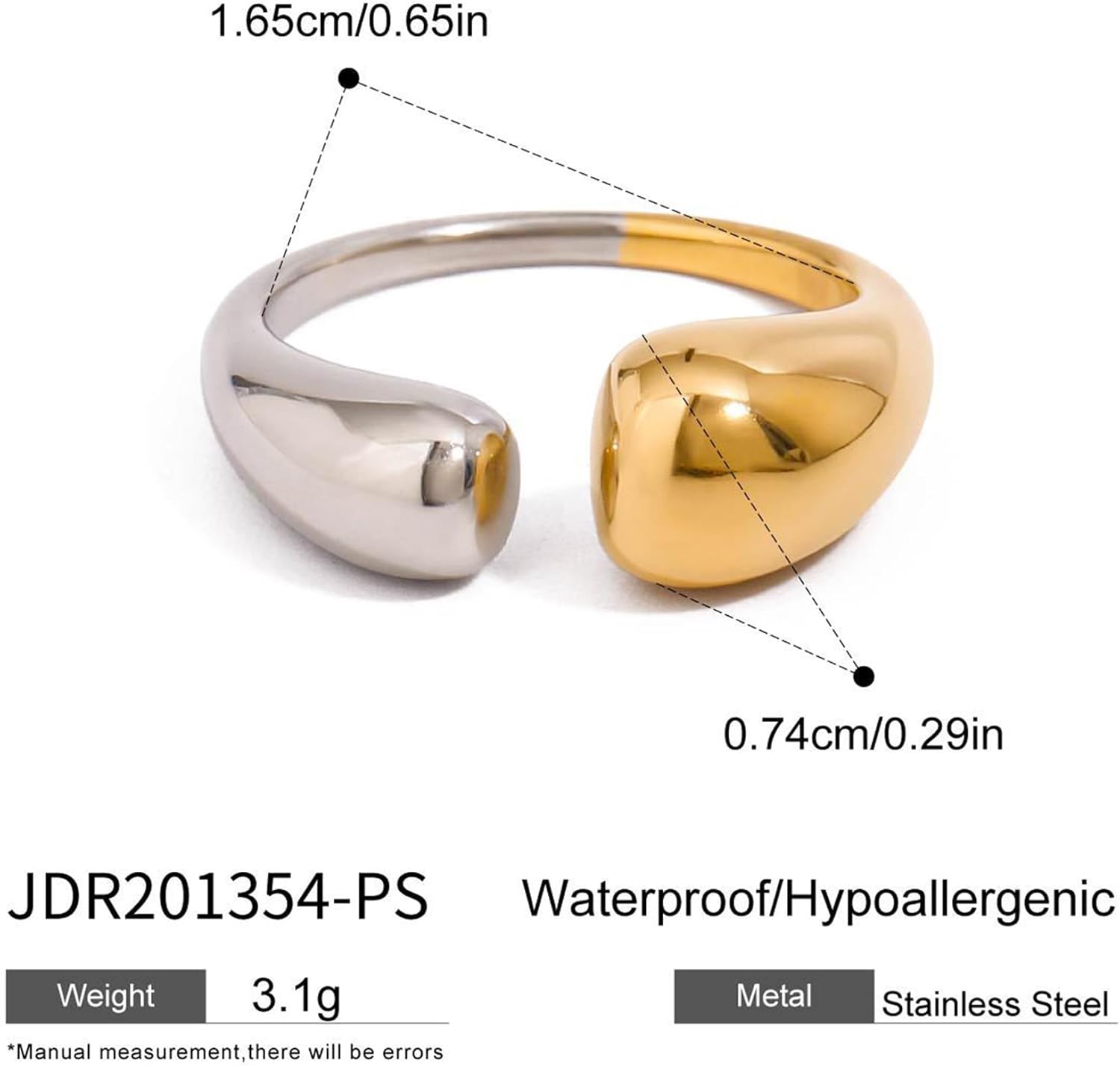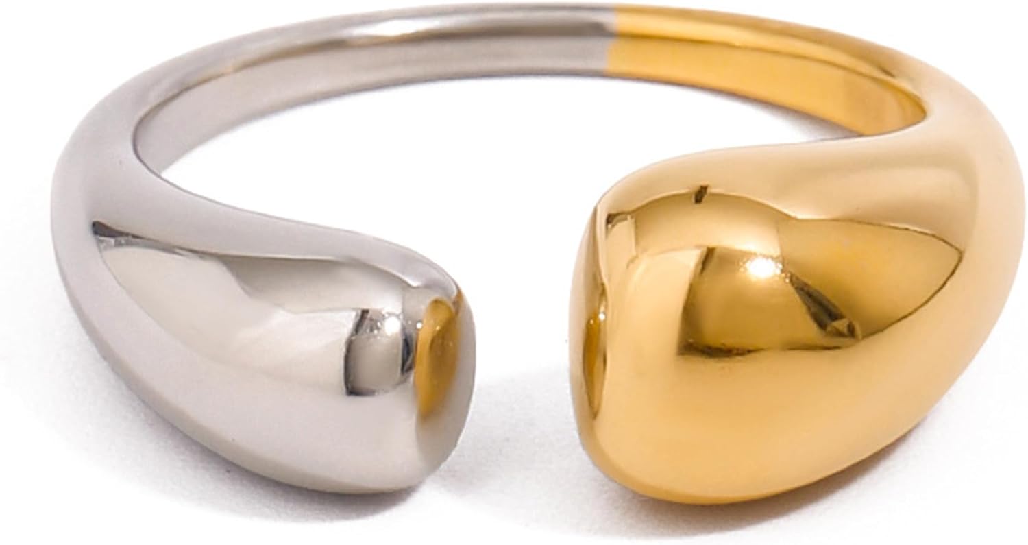 Enhance your jewelry collection with this Two-Tone Open Adjustable Stainless Steel Ring, featuring a modern gold and silver waterdrop design. Made from high-quality stainless steel, this ring is waterproof, hypoallergenic, and resistant to fading, ensuring long-lasting durability. The adjustable open design allows for a custom fit, making it a versatile accessory for any occasion. Whether worn alone as a statement piece or stacked with other rings, it adds a touch of elegance and sophistication to any outfit. A perfect gift for women on birthdays, anniversaries, or Valentine’s Day.