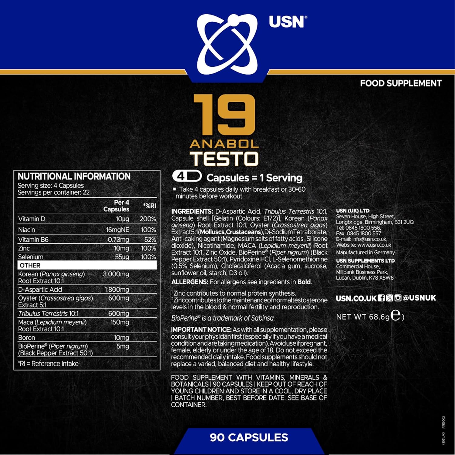 Unleash your potential with USN’s 19 Anabol Testo. A premium Testosterone Support Supplement—formulated specifically for men who demand more from their daily performance. Each serving delivers a science-backed blend of D-Aspartic Acid, Zinc, and Vitamin D to help naturally maintain optimal testosterone levels, while Maca Root and Tribulus Terrestris support energy, strength, and vitality. Korean Ginseng and BioPerine® work synergistically to enhance absorption and promote mental focus and endurance. Crafted by USN, a trusted name in sports nutrition, this powerful formula is more than a testosterone booster—it’s a daily ally for men looking to stay sharp, strong, and driven. Whether you’re an athlete, professional, or anyone committed to wellness, these 90 easy-to-take capsules integrate seamlessly into your active lifestyle.