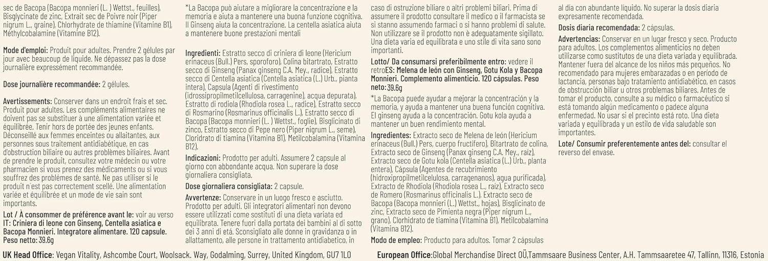 Maximum Nutritional Benefits – Vegan Vitality’s mushroom supplement contains Lion’ s Mane mushroom extract, Bacopa Leaf extract,Gotu Kola, Vitamin B12, Vitamin B1 and Ginseng which helps to sustain energy, performance and focus throughout the day.