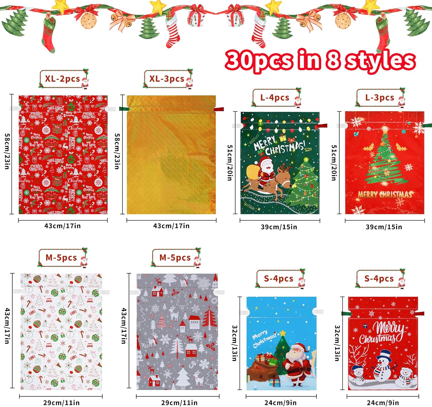 【Christmas Gift Bags Assorted Sizes】: You will get 30 xmas gift bags of various sizes. Extra large (58×43 cm, 5 pcs), large (51×39 cm, 7 pcs), medium (43×29 cm, 10 pcs), small (32×24 cm, 8 pcs) and 8 different styles of Christmas pattern designs for packaging Various Christmas gifts.