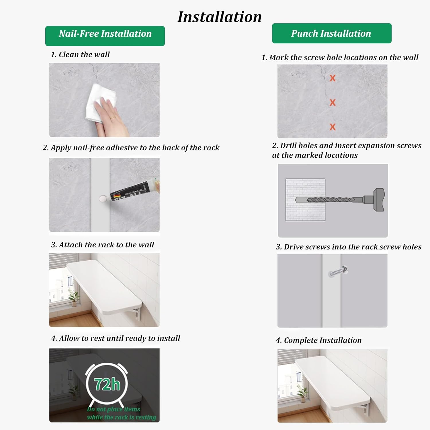 Two Installation Methods: Kitchen storage shelf offers two installation methods: punch-hole and punch-free. The package includes a level, expansion screws, and punch-free adhesive for easy installation