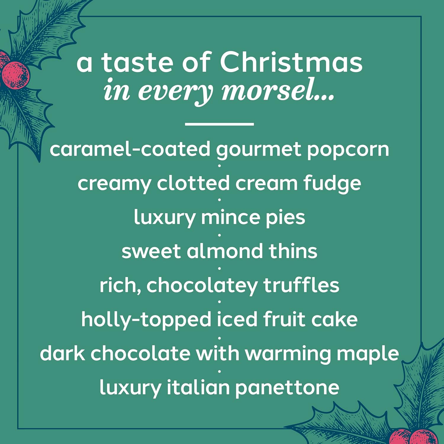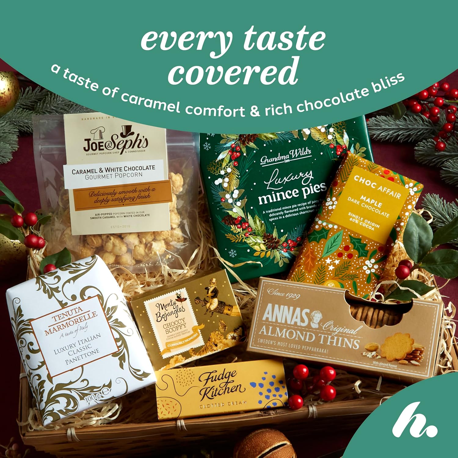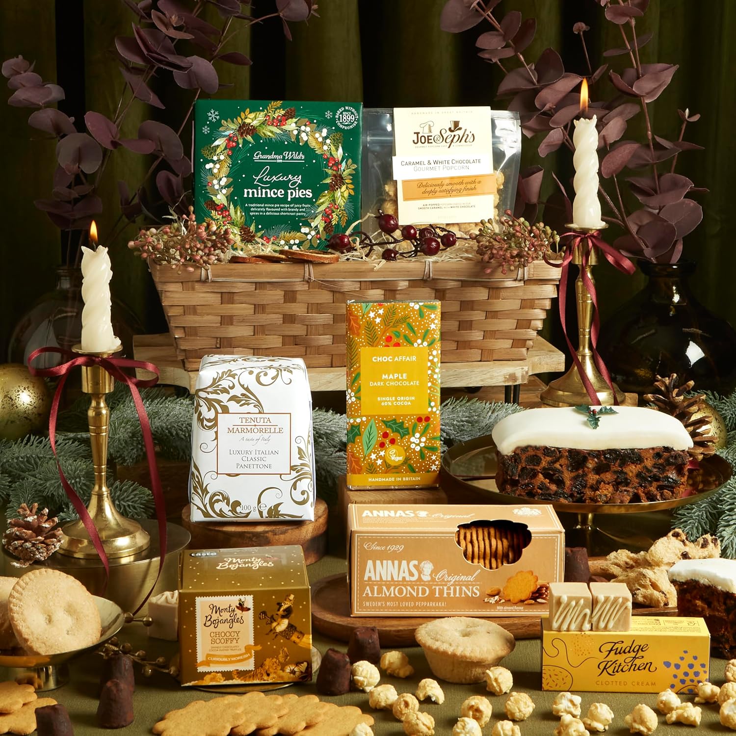 SWEET, FESTIVE & INDULGENT – Brimming with wintry favourites, this gourmet hamper includes a traditional iced fruit cake, maple dark chocolate, Italian panettone, clotted cream fudge and artisan truffles – a Christmas feast of sweet delights