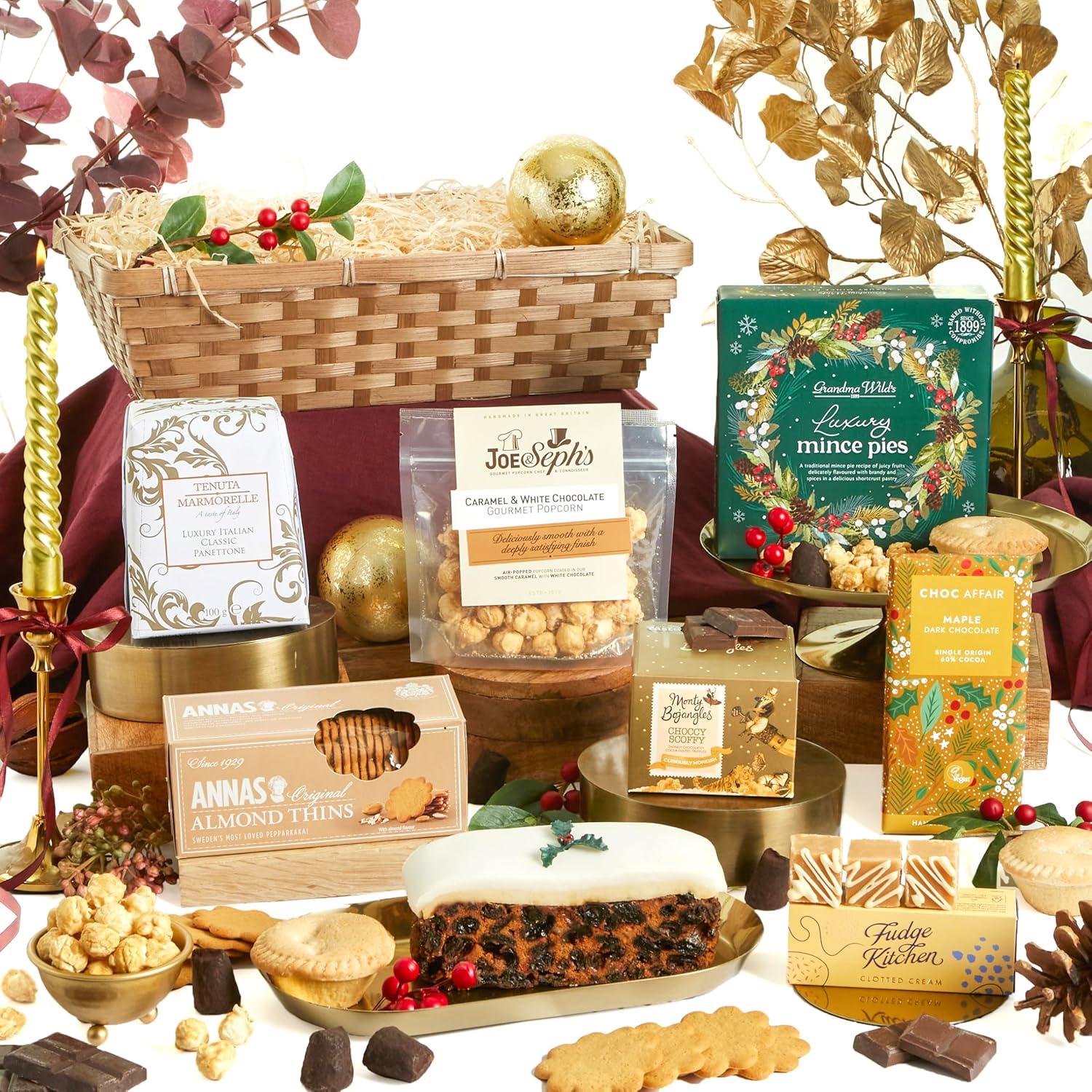 SWEET, FESTIVE & INDULGENT – Brimming with wintry favourites, this gourmet hamper includes a traditional iced fruit cake, maple dark chocolate, Italian panettone, clotted cream fudge and artisan truffles – a Christmas feast of sweet delights