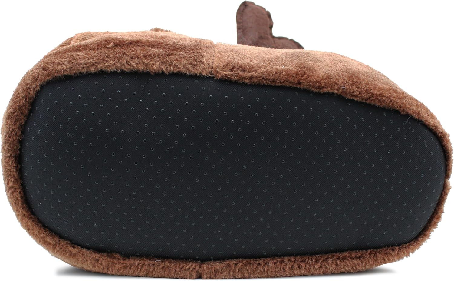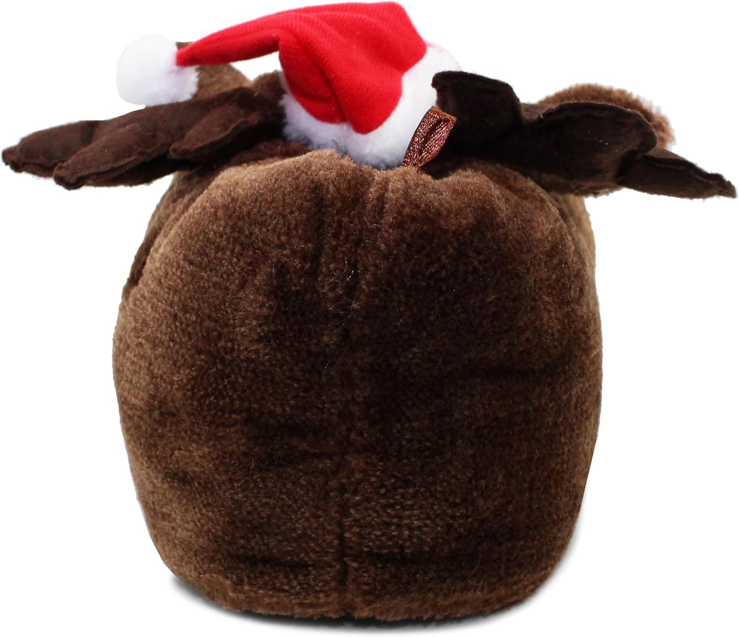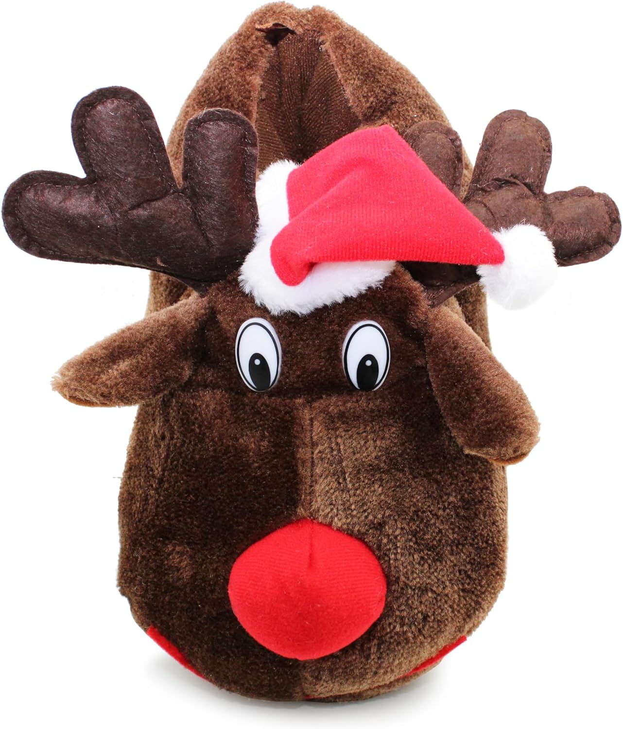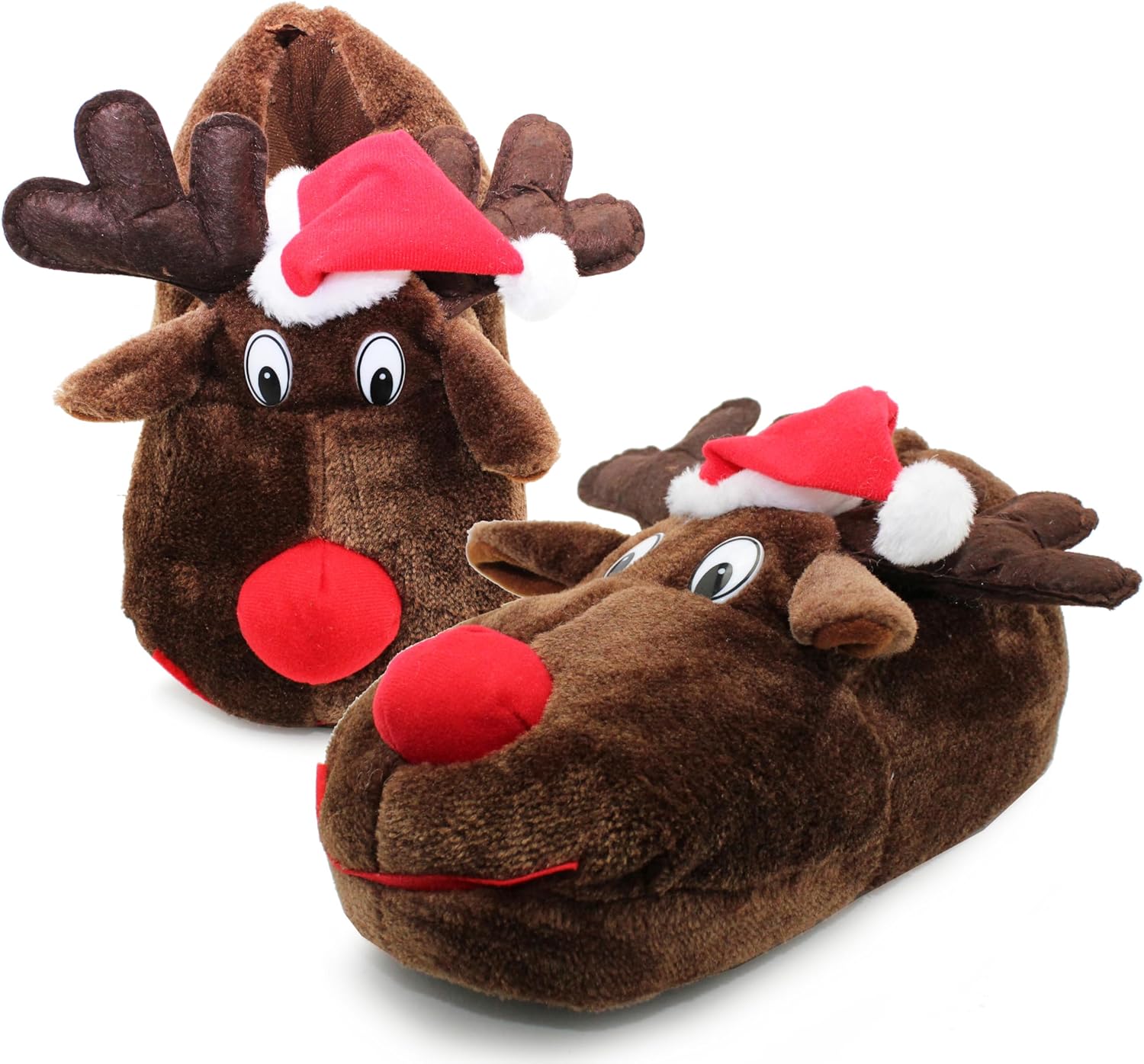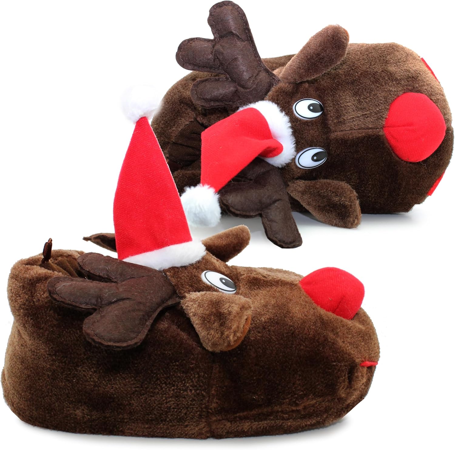 Two plush reindeer-shaped slippers with red noses and Santa hats. Brown fuzzy material with white accents for the eyes.Two plush reindeer-shaped slippers with red noses and Santa hats. Brown fuzzy material with white accents for the eyes.