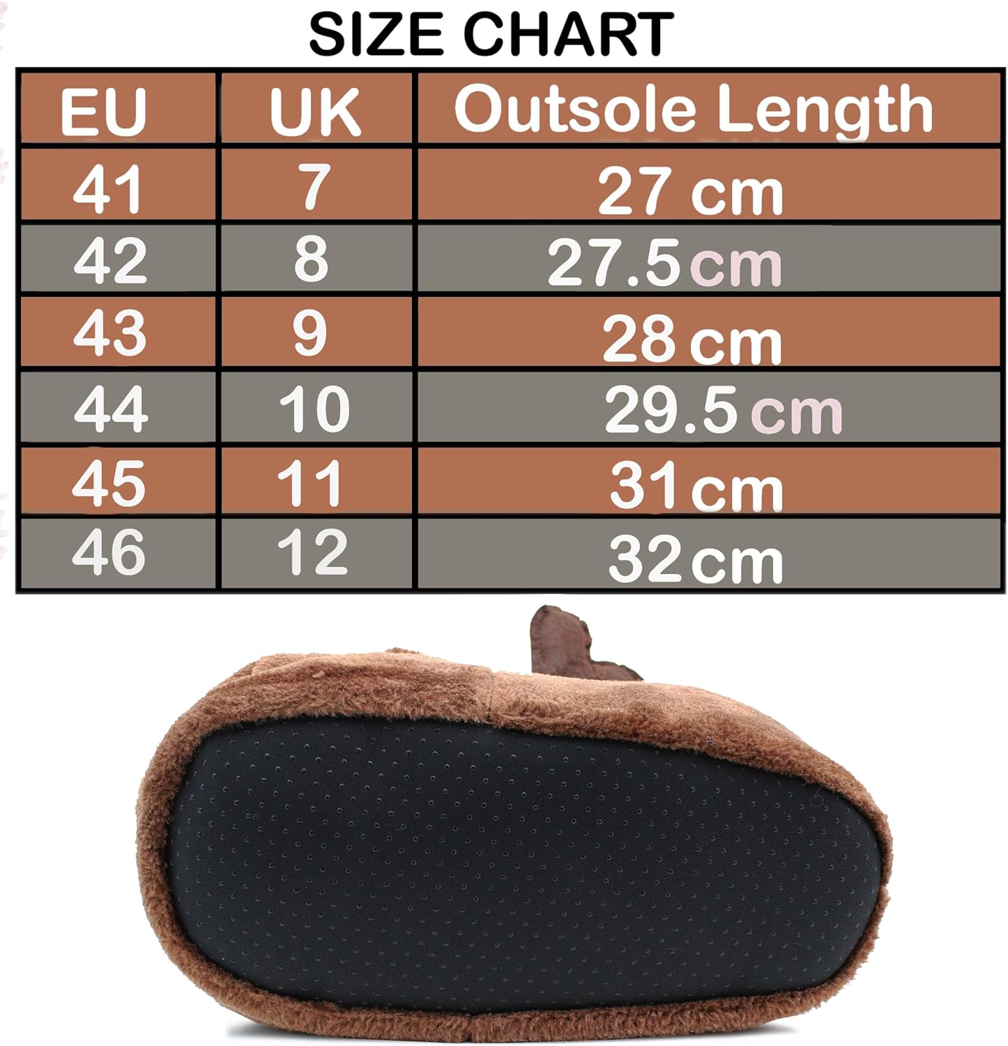 Shoe size chart showing EU, UK, and outsole length measurements from sizes 41 to 46. Brown fuzzy slipper sole visible below.Shoe size chart showing EU, UK, and outsole length measurements from sizes 41 to 46. Brown fuzzy slipper sole visible below.