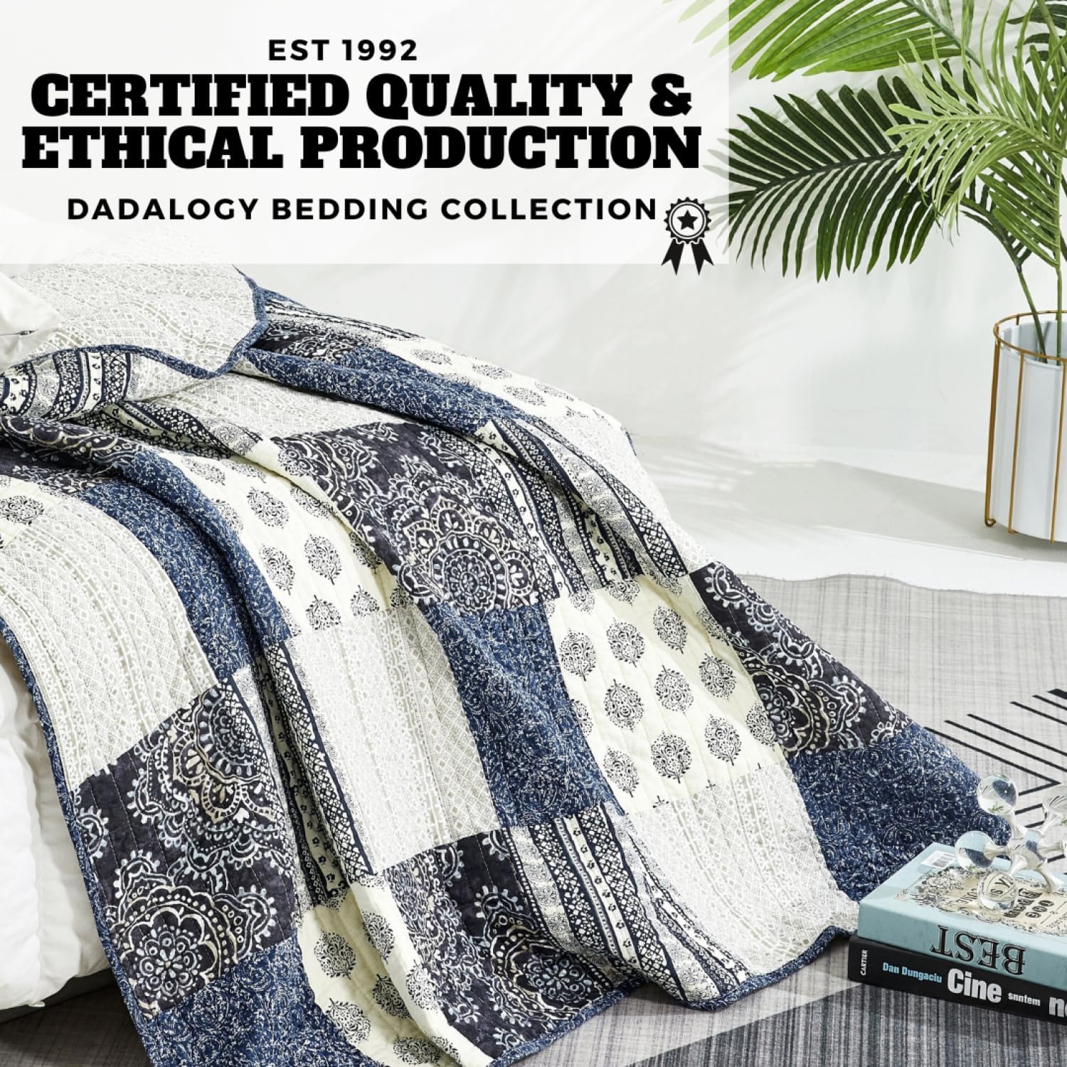 Immerse yourself in warmth and comfort with our DaDa Bedding Cottage Throw Blanket. Expertly crafted in a luxurious quilted cotton, this throw in a sophisticated navy blue, reminiscent of premium denim, blends seamlessly with any décor. Measuring 50″ x 60″, it’s the ideal size to drape over your lap, sofa, or bed, providing a cozy layer of warmth wherever needed. Key Features: High-Quality Material: Crafted from top-quality cotton, ensuring durability and softness. Quilted Design: The intricate quilted pattern gives a unique and elegant look, making it a chic addition to any room. Versatile & Stylish: Perfect as a patchwork lap throw, it also serves as a fashionable accessory for your sofa or bed, enhancing your space with its denim-inspired navy color. Size & Color: Generously sized at 50″ x 60″ and in a rich, navy blue, it’s a statement piece for any setting. Benefits: Comfort: Provides an extra layer of warmth, ideal for those chilly evenings. Decorative: The elegant patchwork design elevates the aesthetic of any room. Practical: Lightweight and easy to carry, making it perfect for any occasion, indoor or outdoor. Whether you’re curling up on the sofa with a good book, adding an extra layer of warmth to your bed, or accenting your living space, this navy blue patchwork quilted lap throw from DaDa Bedding Collection is a versatile choice. It’s not just a blanket; it’s a stylish addition to your home décor. Perfect for anyone appreciating a blend of comfort and style in their everyday living space. Care Instructions: Machine wash cold, gentle cycle. Tumble dry low. Do not bleach. Transform your space with the understated elegance and softness of our Premium Navy Blue Patchwork Quilted Lap Throw Blanket. Order yours today and experience the luxurious comfort and style that comes with every DaDa Bedding product!