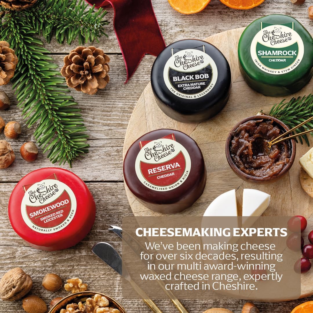 Legendary Black Bob Extra Mature 18 Month Cheddar Waxed Truckle 200g, Smooth, Moreish and crafted to the Cheshire Cheese Company signature recipeAward Winning*, Reserva Caramelised Onion & Rioja Cheddar Waxed Truckle 200g (*Gold Award at the International Cheese & Dairy Awards 2021)Irresistible Smokewood, Smoked and Meticulously Aged Red Leicester Waxed Truckle 200gIndulgent Caramelised Red Onion artisan Chutney (200g)Small-batch Cheddar Biscuits for Cheese (140g), Baked to perfection
