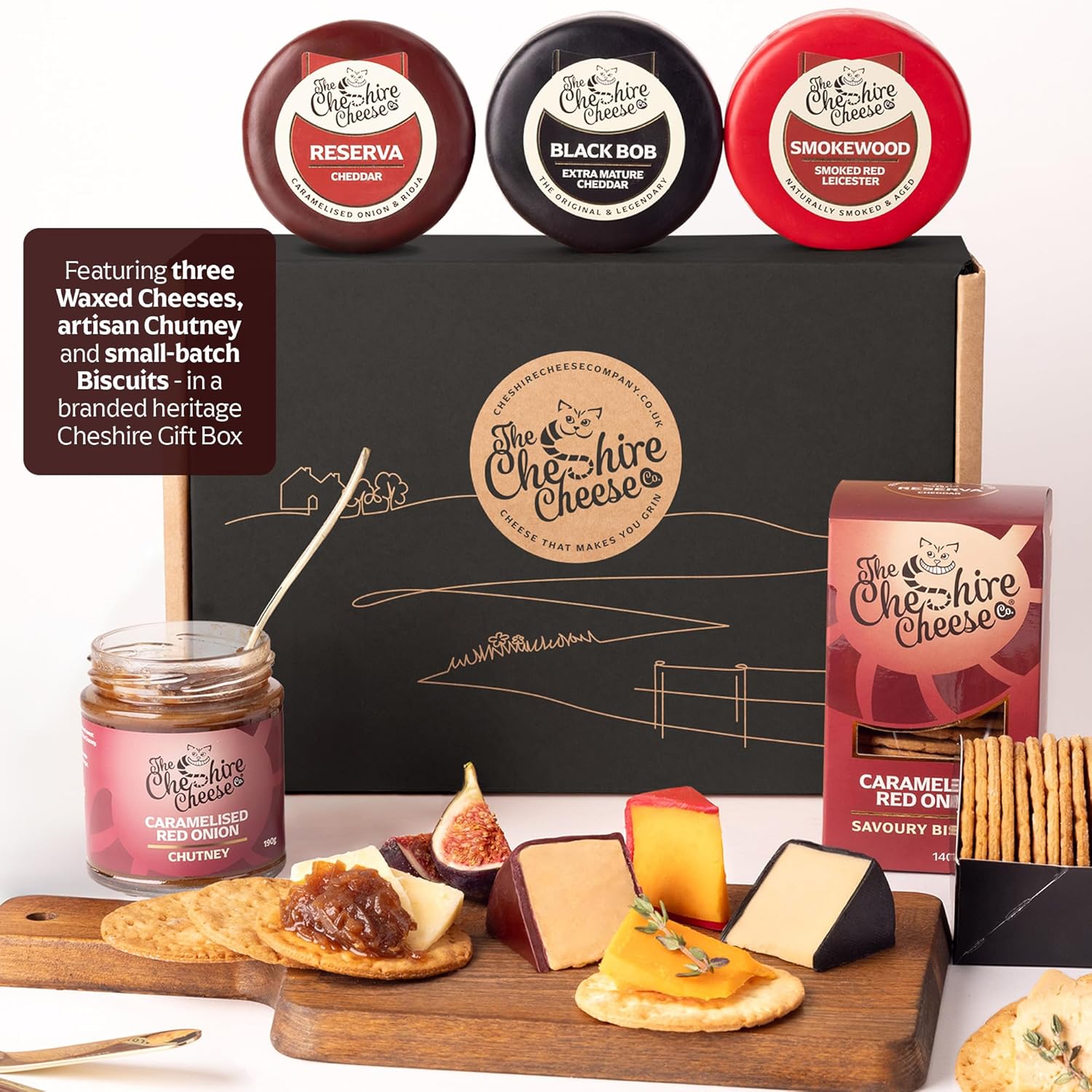CHEESE HAMPER GIFT SET: This gift includes three premium waxed cheeses (Black Bob Extra Mature Cheddar, Reserva Caramelised Onion & Rioja Cheddar, Smokewood Smoked Aged Red Leicester), paired with artisan Cheddar biscuits and Caramelised Red Onion Chutney, all presented in a Cheshire Cheese Company Gift Set. A ready-to-gift gourmet hamper ideal for birthdays, Christmas, and foodie gifting occasions.