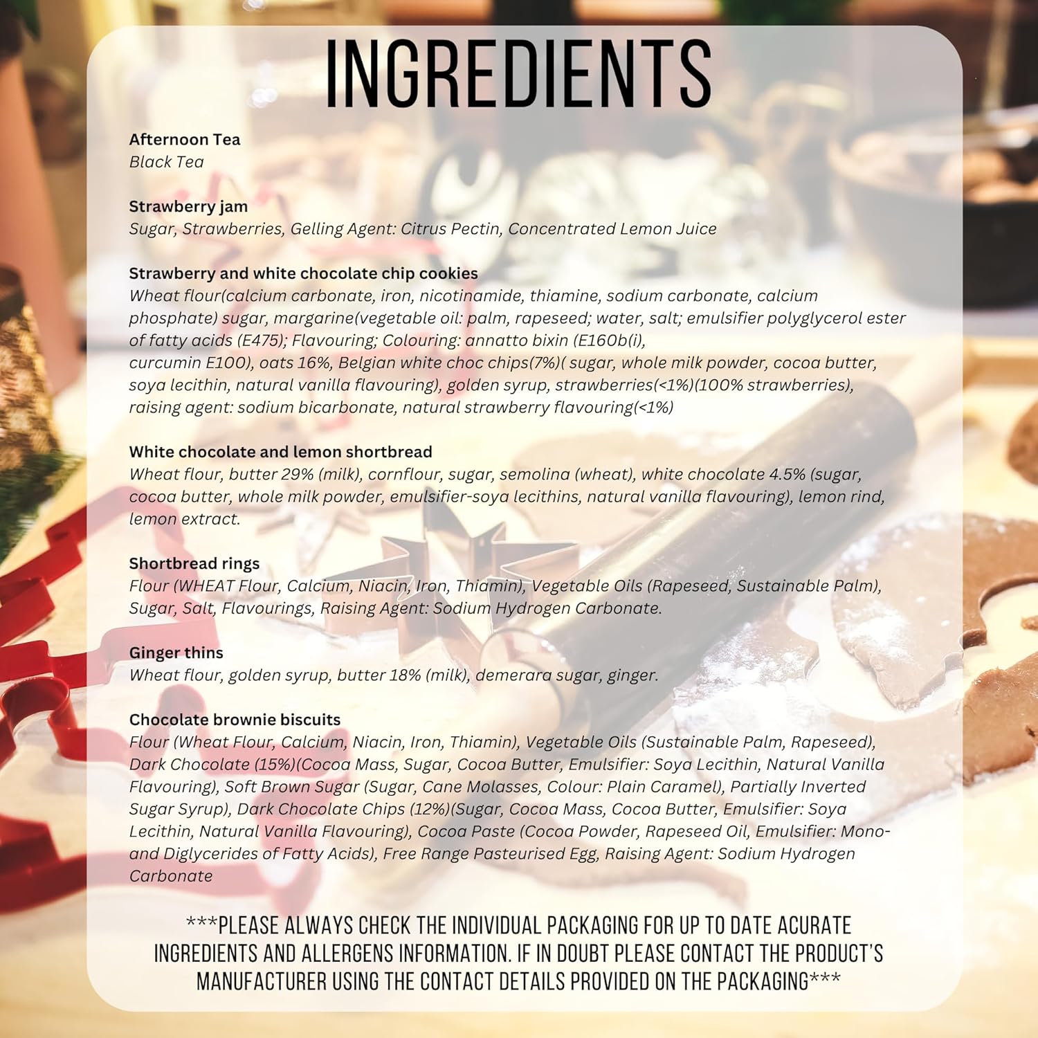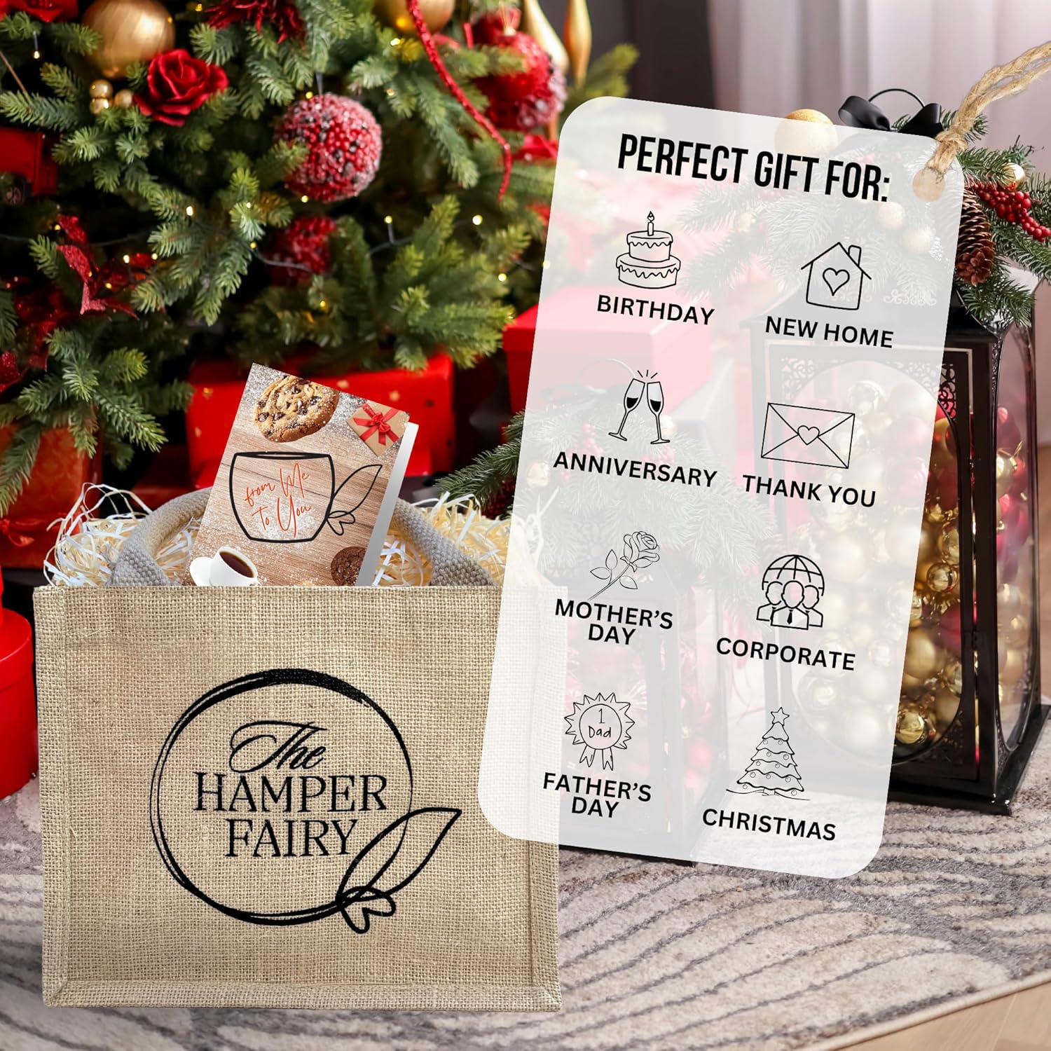 Inside the luxury Jute Gift Bag you will find the finest assortment: Afternoon Tea, White Chocolate and Lemon Shortbread, Strawberry Jam, Brownie Biscuits, Ginger Biscuits, Strawberry and White Chocolate Chip Cookies and Shortbread Rings. This Gourmet Food Hamper Gift is sure to impress!