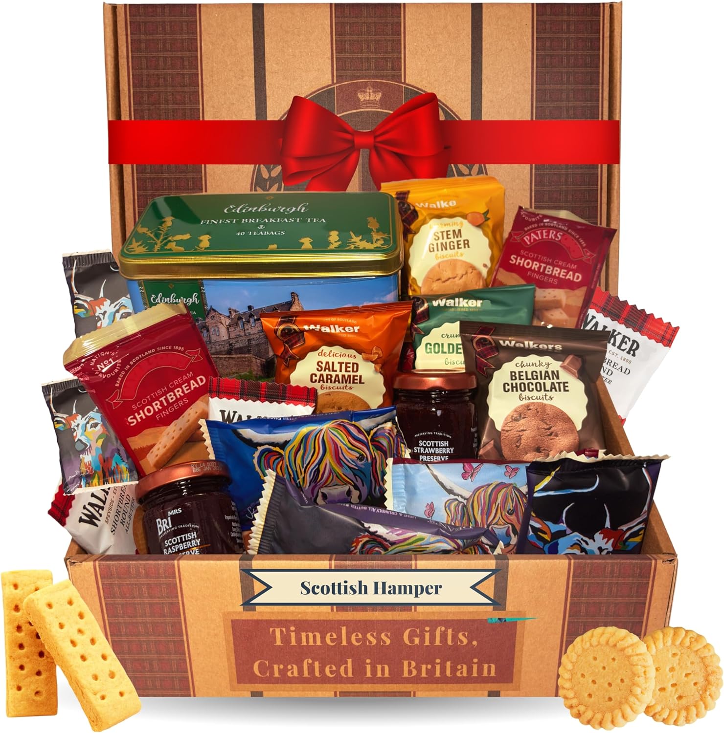 Discover a luxury Scottish hamper, a Scottish biscuits gift set with 10 packs of Scottish shortbread and luxury biscuits. Paired with preserves and an Edinburgh tea tin, it’s ideal Scottish gifts for men or Scottish Christmas gifts. This Scotland hamper, a short bread biscuits gift, showcases Scottish food gifts with rich heritage. The luxury shortbread elevates any occasion, presented in a Scottish hamper for a truly refined gifting experience.