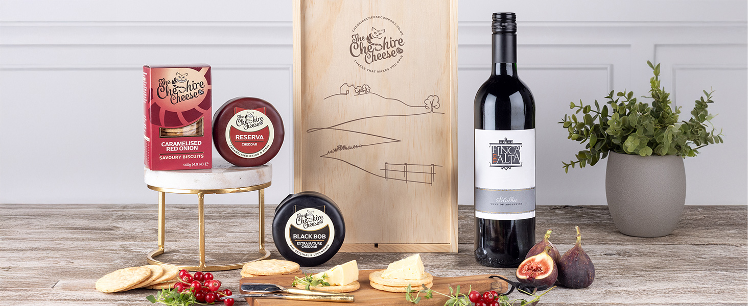 INCLUDES: The Duo Wine and Cheese Hamper contains 1 x 200g Black Bob Extra Mature Cheddar truckle, 1 x 200g Reserva Caramelised Onion and Rioja Cheddar truckle, 1 x 140g Caramelised Onion Biscuits for Cheese, 1 x 75cl Bottle of Finca Del Alta Argentinian Malbec, presented in an engraved Cheshire Cheese Company Heritage Wooden Gift Hamper Box, so this wine gift is ready to give or be sent direct to any recipient.