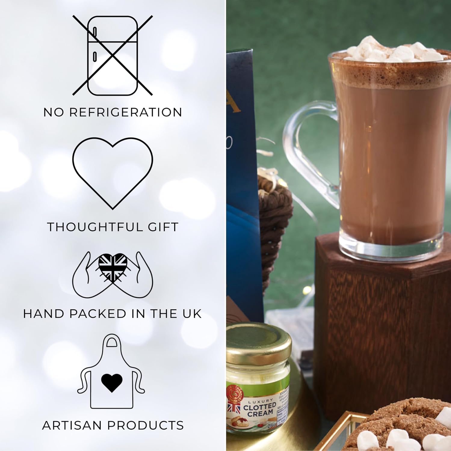 GOURMET FOOD HAMPER: Savour rich drinking chocolate from Manuel, Franks double chocolate biscuits, fluffy marshmallows, premium milk chocolate from Crea, white chocolate praline, a hot chocolate bomb, oat flips, and authentic Devon clotted cream.