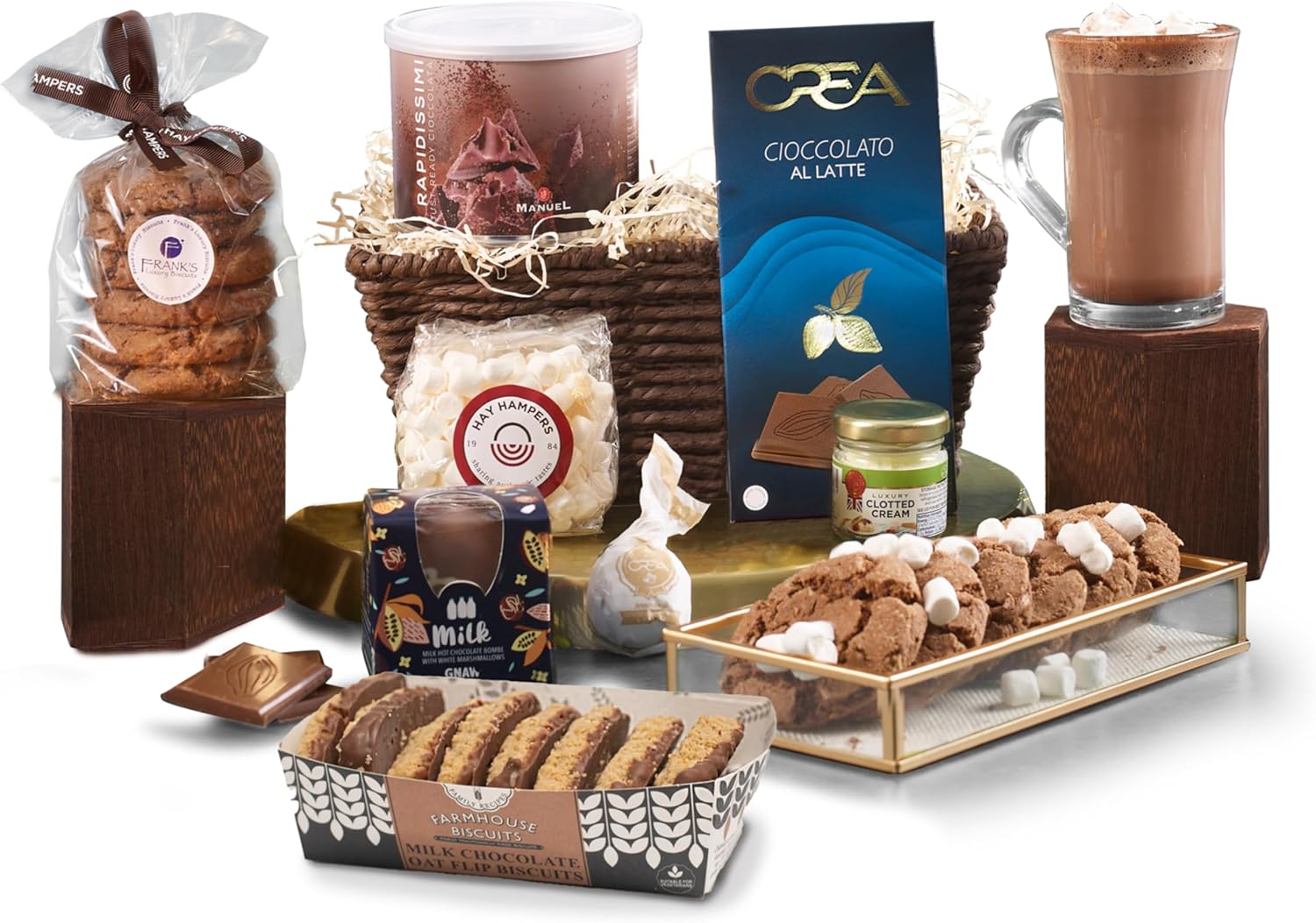 GOURMET FOOD HAMPER: Savour rich drinking chocolate from Manuel, Franks double chocolate biscuits, fluffy marshmallows, premium milk chocolate from Crea, white chocolate praline, a hot chocolate bomb, oat flips, and authentic Devon clotted cream.