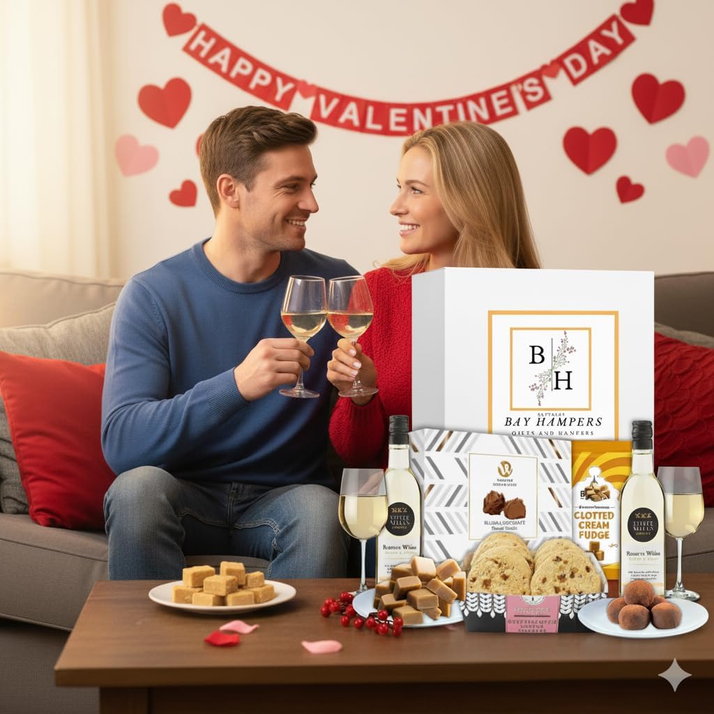 Our luxury valentines gifts for her him food gifts for couples men women contains 2 x 18.7Cl white Wine, Border Biscuits gIft set , fudge , yummy chocolate truffles balls