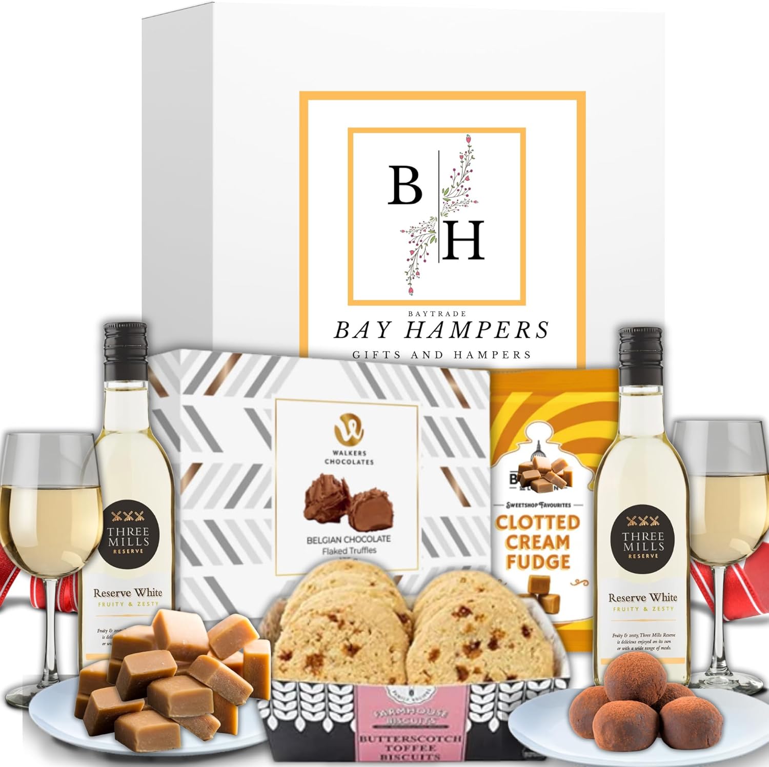 Make any celebration memorable with this luxury White Wine Gift Hamper. Inside you will find two bottles of white wine in generous 18.7 cl bottles paired with a selection of premium treats that complement the wine perfectly. The hamper includes smooth Belgian chocolate truffles, delicious butterscotch biscuits and creamy clotted cream fudge for an indulgent tasting experience. Each item is selected for quality and makes this gift set ideal for relaxing evenings, celebrations or a thoughtful gesture of appreciation. Perfect for women and men of all ages, this hamper suits many occasions. Choose it for Christmas, Mothers Day, Fathers Day, Valentines Day, birthdays, thank you gifts or simply to brighten someone’s day. Presented in a stylish gift box, this hamper arrives ready to give. Whether you want to spoil a loved one or treat yourself, this elegant collection of wine and sweet treats is a lovely way to enjoy a moment of luxury.