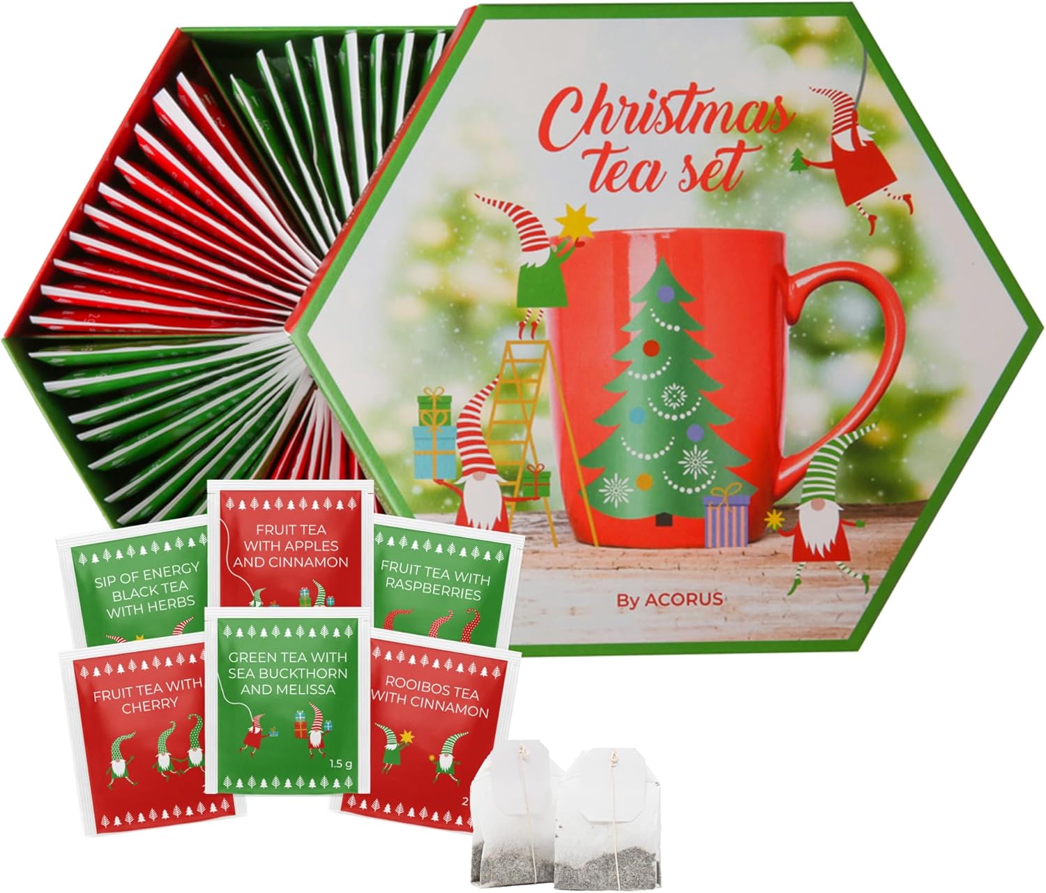 CHRISTMAS WITH A LARGE 60-TEA SACHET TEA SAMPLER. This ultimate herbal tea box is crafted for the winter season, featuring flavors perfect for cozy winter evenings. Enjoy a variety of fruity and herbal teas with family and loved ones throughout the Christmas period.