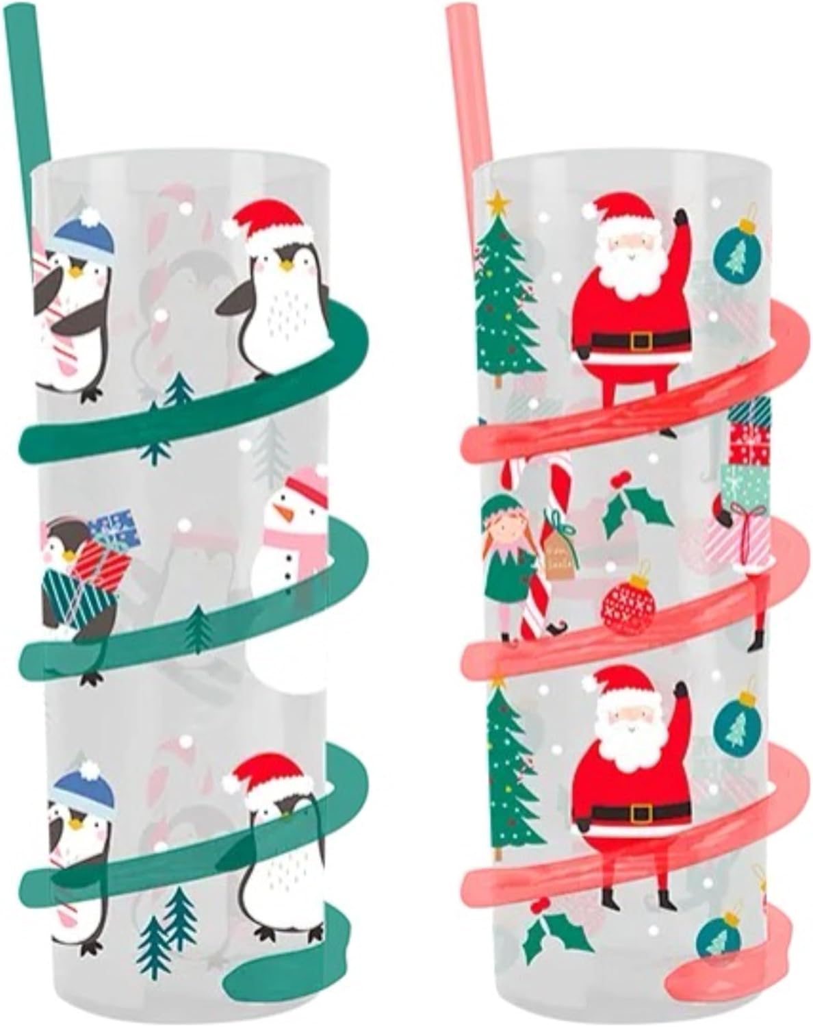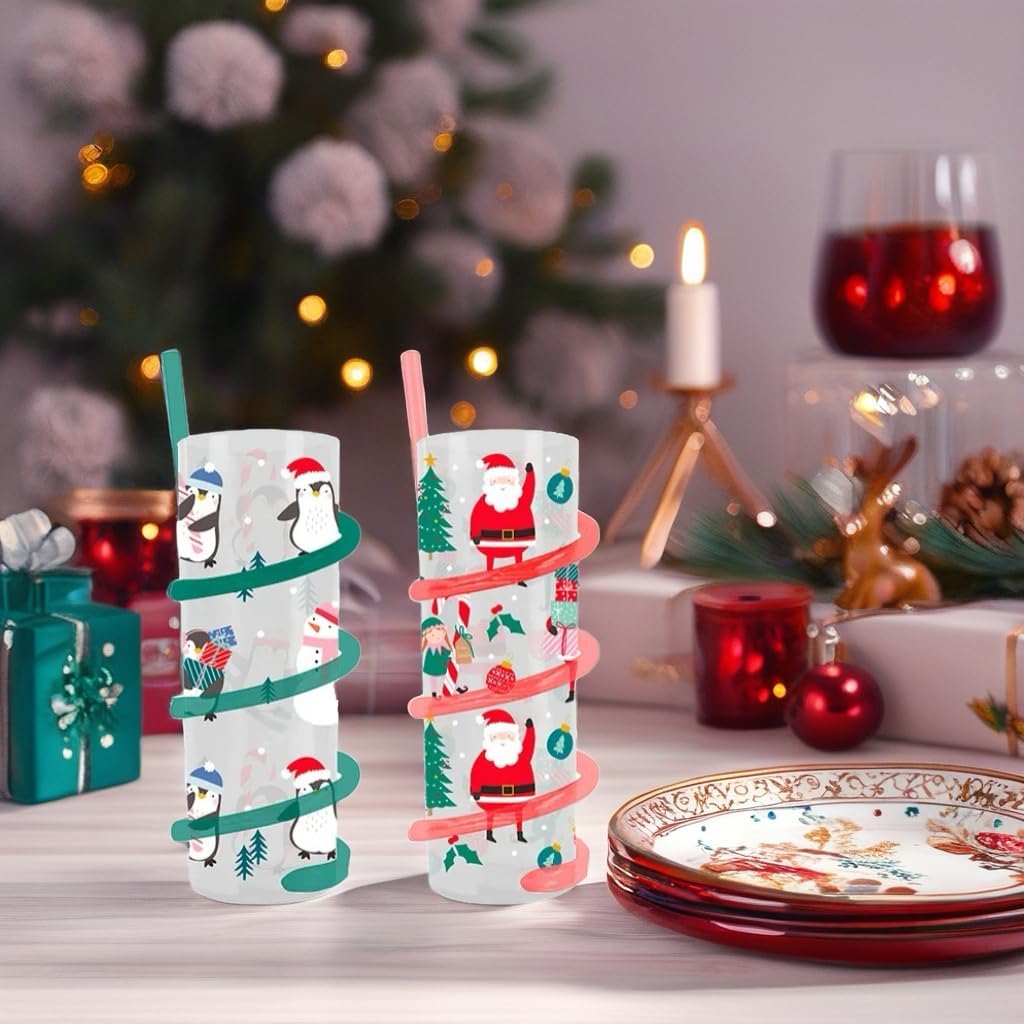 FESTIVE DESIGN: Bring festive fun to drink time with this delightful set of two Christmas spiral straw tumblers. Each tumbler features charming festive character designs that will spark joy during the holiday season. Set of 2 Christmas-themed tumblers featuring adorable holiday characters, perfect for adding a touch of seasonal cheer to any drink