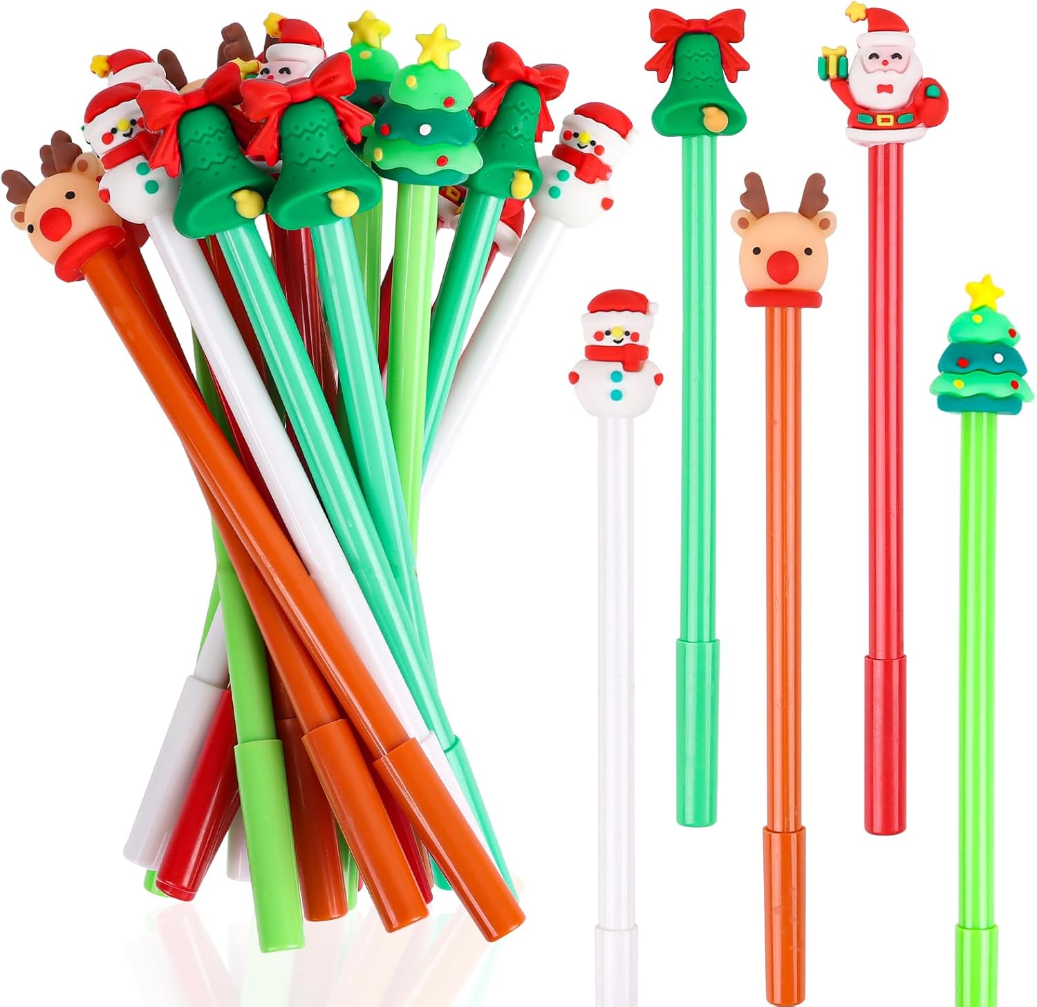 CUTE CHRISTMAS DEGISN- Each pen showcases an adorable rubber figurine atop the cap depicting reindeer, snowmen, jingle bells, Christmas trees, and Santa Claus, perfectly colour-coordinated with the pen barrel to create a visually harmonious and festive writing instrument.